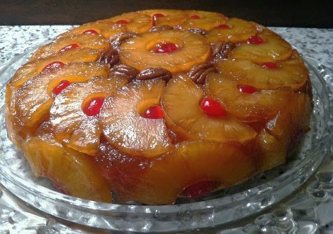 Queque húmedo de Vainilla decorado con piña y miel de piña.
